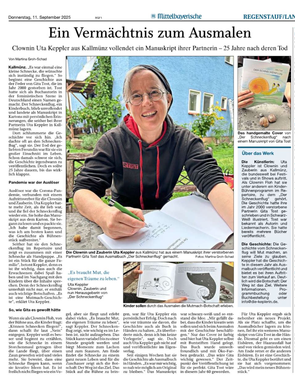 Hintergrund-Artikel zu meinem Clownstück der Schneckenflug anlässlich der Veröffentlichung des Schneckenflug-Ausmalbuchs in der Mittelbayerischen Zeitung vom 11. Sept. 2025 |