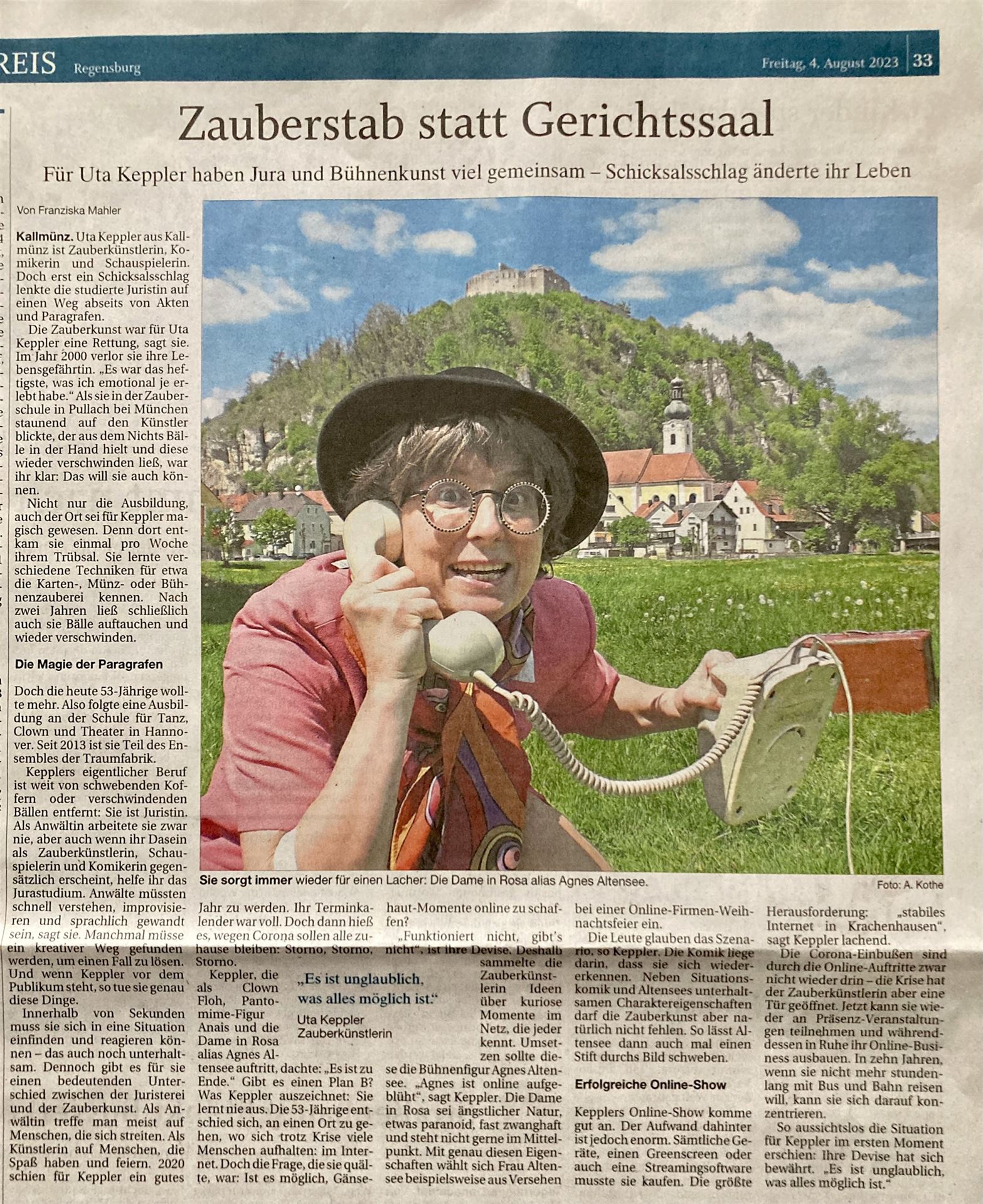 Während der Pandemie hat Uta Keppler ein innovatives und interaktives Online-Solo-Zauber-Format für ihre Bühnenfigur Agnes Altensee entwickelt, mit dem sie online auf Konferenzen, Meetings und Seminaren auftritt. Agnes Altensee ist ein im wahrsten Sinne des Wortes komischer Gast in der Tradition der "Komischen Figuren".